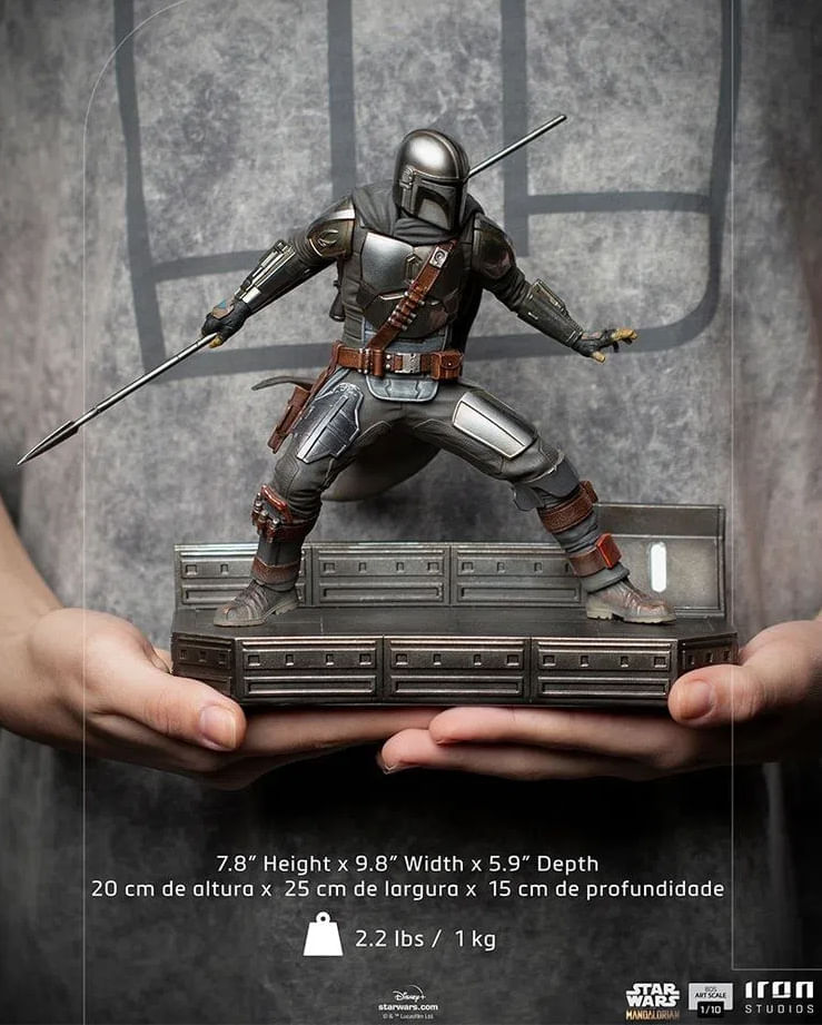Pronto para enfrentar seu oponente, o caçador de recompensas mandaloriano Din Djarin, mais conhecido como Mando, fixa sua perna direita em apoio e a esquerda preparada para o ataque, sobre a base do piso da espaçonave Imperial de seu inimigo. Portando sua lança de Beskar, feita de uma liga metalica usada também nas armaduras mandalorianas, conhecida por sua resistência até mesmo ao ataque de um Sabre de Luz, ele usa todas suas habilidades de combate em sua missão pessoal de resgate a pequena e misteriosa criança chamada Grogu, ou Baby Yoda como é popularmente conhecido, com a qual criou laços afetivos paternos. Inspirada na cena final no último episódio da 2ª temporada da série Mandalorian, spin-off de Star Wars criado por Jon Favreau e exibida no streaming Disney+, onde o herói protagonista trava seu duelo decisivo contra Moff Gideon, um oficial de inteligência do decadente Império Galáctico, a Iron Studios traz a estátua "Mandalorian BDS Art Scale 1/10 - The Mandalorian - Iron Studios". Na épica conclusão dessa temporada, o episódio intitulado "The Rescue", apresenta Mando e seus aliados em busca de salvar Grogu capturado por Moff Gideon, embarcando em seu cruzador imperial, enfrentando os terríveis droids Dark Troopers e disposto a tudo, Din Djarin duela com Gideon, com o vilão portando o lendário Sabre Sombrio. Fiel aos mínimos detalhes, produzido com referências oficiais da série, essa estátua compõe um diorama dessa cena ao lado da peça "Moff Gideon BDS Art Scale 1/10 - The Mandalorian - Iron Studios", vendida separadamente. Um conjunto imperdível para qualquer fã e colecionador, criado exclusivamente pela Iron Studios!