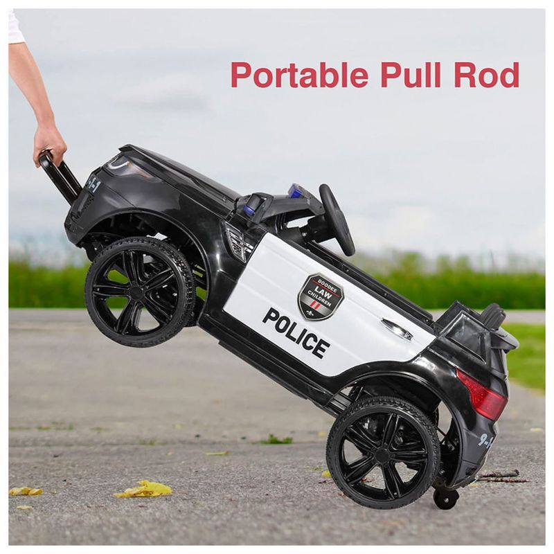 FUNÇÕES MÚLTIPLAS Passeio em carro policial, megafone real, luzes e faróis policiais de trabalho, buzina, espelho retrovisor, entrada e reproduções de MP3, interruptor de alta , média , baixa velocidade, com portas que podem abrir e fechar. Dando ao seu filho uma experiência quase real de dirigir um carro de polícia.