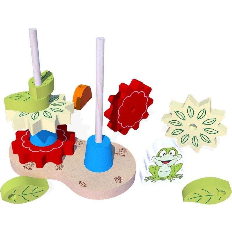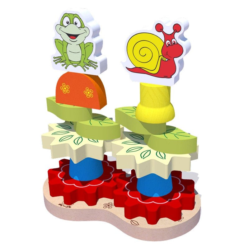Trabalha a coordenação motora, sobreposição das peças para rodar as engrenagens. Reconhecimento das formas, cores, tamanhos e espaços.