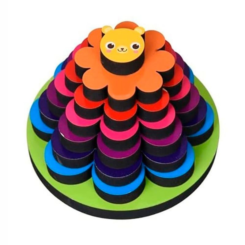 Contém 1 base com pino central e 6 peças para encaixar e empilhar.