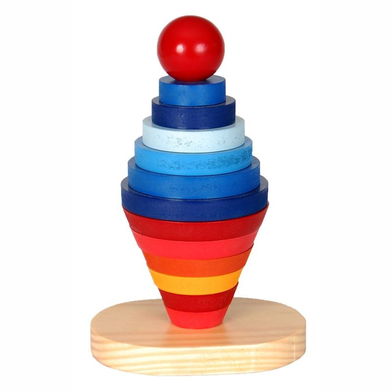 Composto por uma base em madeira e mais 12 peças também em madeira, são coloridas em formato cilíndrico e cônico com medidas diversas.