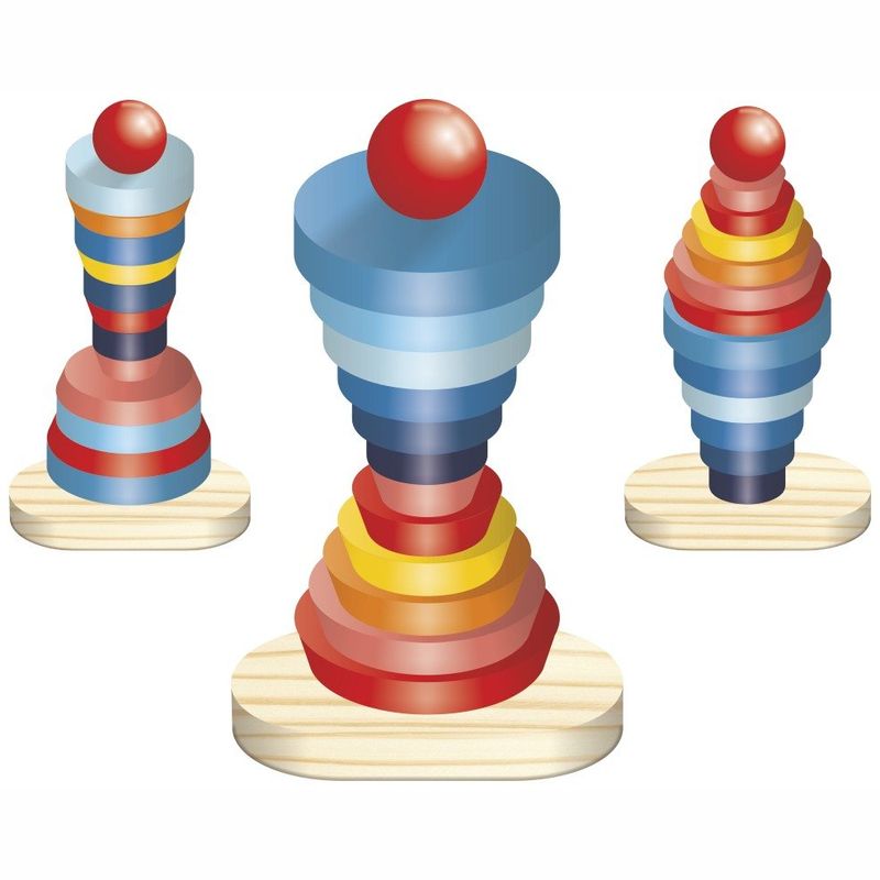 Composto por uma base em madeira e mais 12 peças também em madeira, são coloridas em formato cilíndrico e cônico com medidas diversas.