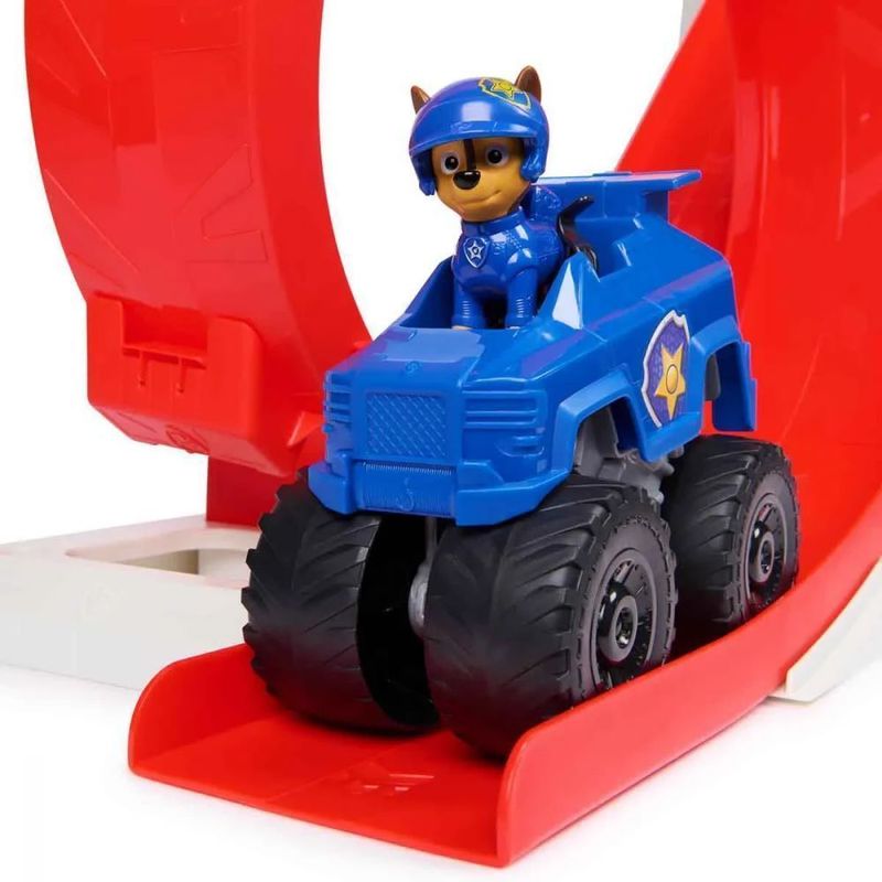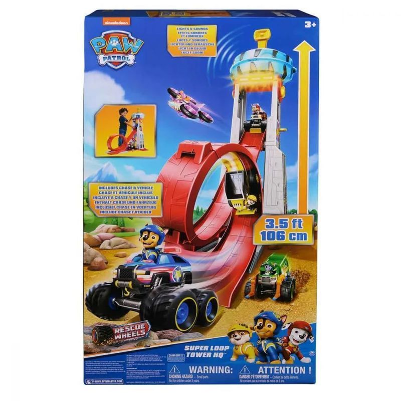 Prepare-se para emocionantes missões de resgate em alta velocidade com Chase e seu caminhão monstro com tema de carro de polícia e rodas grandes, no novo QG da Patrulha Canina: Rescue Wheels! Esta impressionante Torre da Patrulha Canina tem mais de um metro de altura e conta com luzes e sons, para uma experiência envolvente. Esta é a maior Torre de Patrulha Canina já feita, com sua rampa circular gigante, um centro de comando que se abre para acomodar 6 filhotes e vagas de estacionamento para seus veículos da Patrulha Canina (cada um vendido separadamente). Abra o teto para acessar o centro de comando e empurre o volante para ativar luzes e sons, depois empurre a alavanca de lançamento para ouvir ainda mais sons ao lançar seu veículo! Prenda Chase no banco do motorista e coloque-o no topo da rampa, em seguida, empurre a alavanca para lançar Chase pela rampa e ao redor do loop gigante para resgates emocionantes!
