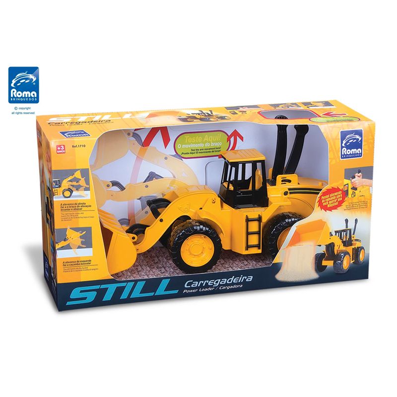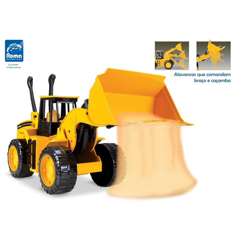 Máquina carregadeira em plástico resistente, com sistema de alavancas para manipular a caçamba para cima e para baixo e design bastante moderno. Possibilita que a criança brinque com a carregadeira imitando uma máquina de verdade, pois possui os mesmos movimentos. O brinquedo não enferruja, pois não tem partes metálicas. A máquina já vem adesivada, o que dá um toque especial ao produto.