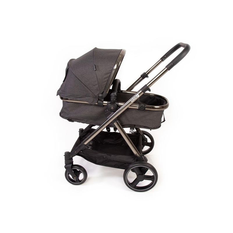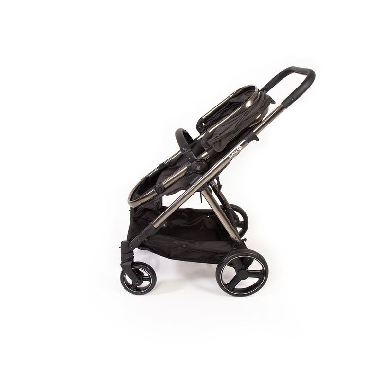 O carrinho possui estrutura leve em alumínio, com acabamento cromado, moderno e atual, revestimento especial na manopla e barra frontal, capota ajustável, ampla, com proteção solar UV50+ e visor, assento reversível, pode ser usado virado para os pais ou para o mundo, acompanhando o crescimento do bebê, facilmente converte-se em assento de passeio, reclinável em 4 posições, encosto ajustável em 2 posições, o diferencial do apoio dos pés, emborrachado, ajustável em 7 posições, que proporciona um maior conforto para os maiorzinhos e praticidade para os pais, cinto de 5 pontos com ajuste de largura e 3 posições de altura, manopla com 5 posições de altura, cesto espaçoso, rodas traseiras grandes, amortecedores, freio centralizado, em um único ponto, com indicador de travamento, controle de giro 360° nas rodas dianteiras, muito mais conforto para o bebê e para dirigir. Fechamento rápido, que pode ser feito com ou sem o assento.