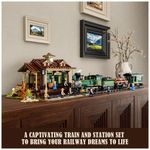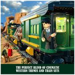 Conjunto de blocos de montar em plástico que reproduz um trem de carga do Velho Oeste em escala 1:76, composto por locomotiva 4-4-0 clássica, vagões de carga, vagão de passageiros e torre de água para composição de cenário ferroviário. A locomotiva utiliza peças específicas para caldeira, chaminé, cabine, engates e rodas, criando um visual inspirado em modelos históricos.