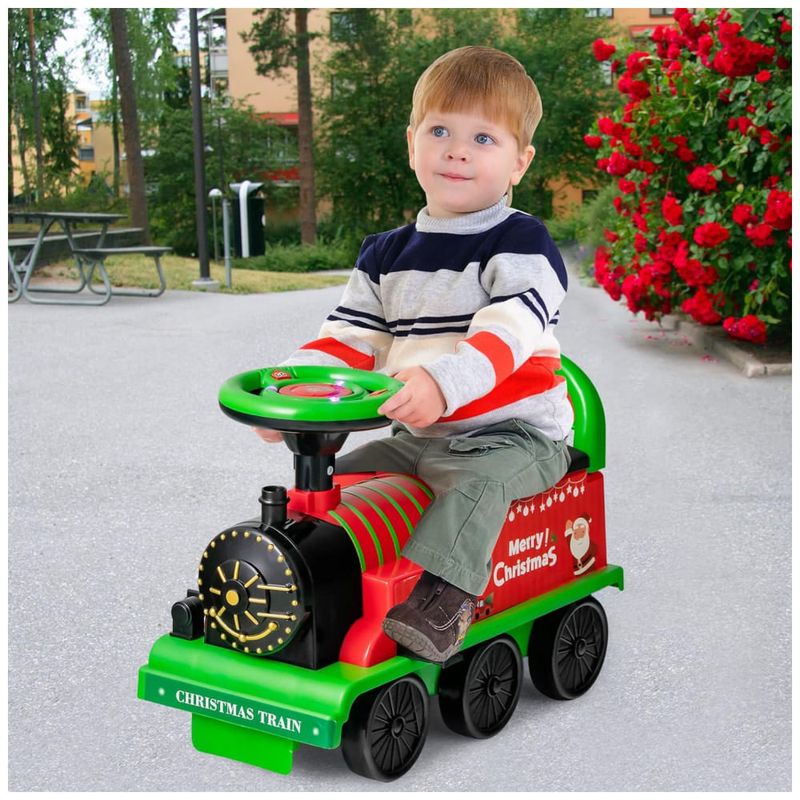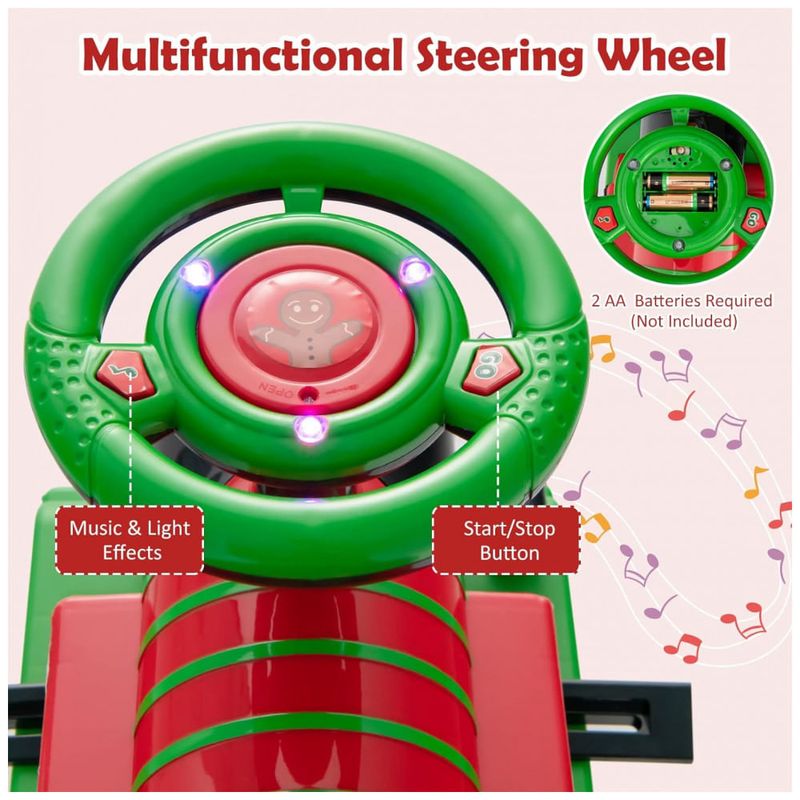 Volante divertido e zenamento extra: O volante multifuncional possui 2 botões práticos: o botão esquerdo permite efeitos de música e luzes, enquanto o botão direito ajuda a iniciar, parar o trem. As crianças também podem girar o volante para controlar a direção. Requer 2 pilhas AA não incluídas. Por outro lado, o espaço de zenamento sob o assento pode guardar brinquedos, livros ou lanches infantis.