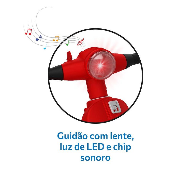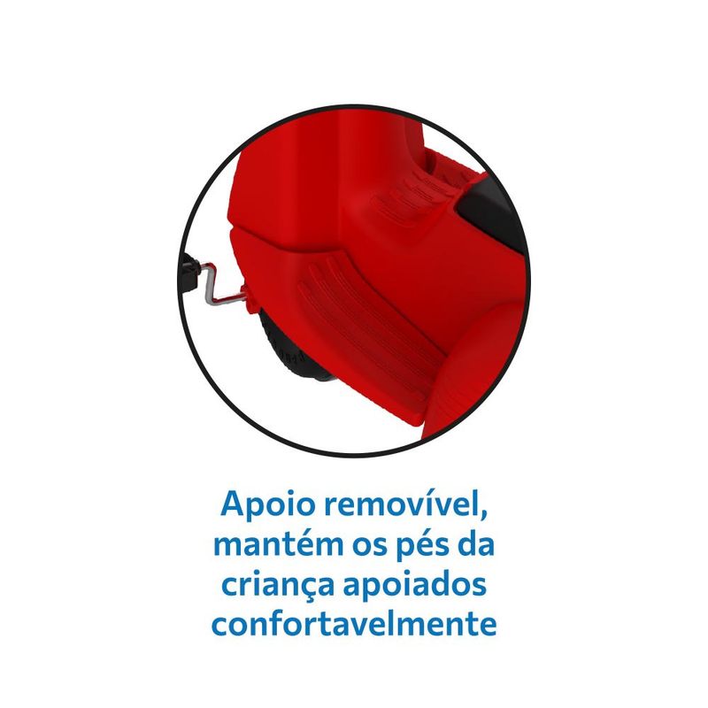 FUNÇÃO PASSEIO: O adulto utiliza a haste direcionável para conduzir a scooter. Basta destravar o dispositivo de roda livre, colocar o cercado de proteção e apoio dos pés. Haste direcionável e removível FUNÇÃO PEDAL: Permite à criança pedalar livremente como um triciclo convencional. Basta travar o dispositivo de roda livre, remover a haste, o cercado e o apoio dos pés. Haste direcionável e removível. Dispositivo de roda livre: Transforma o pedal em apoio para os pés da criança enquanto a scooter é movimentada. Assento anatômico confortável, com baixa distância do solo e altura ideal para a criança subir e descer de forma fácil e segura. Apoio traseiro anatômico. Apoio para os pés removível: Mantém os pés da criança apoiados confortavelmente. Rodas com anel de proteção. Guidão chip sonoro e luz de LED. Cercado de proteção removível e com suporte para garrafa d’água, mamadeira ou squeeze. Suporte para Bolsa/sacola (na alça da haste). Baú sob o assento. Cesto traseiro. Idade: +12 meses. Peso máximo suportado: 30kg. Número do Registro Inmetro 003833/2021 OCP: 0061OCP: 0061
