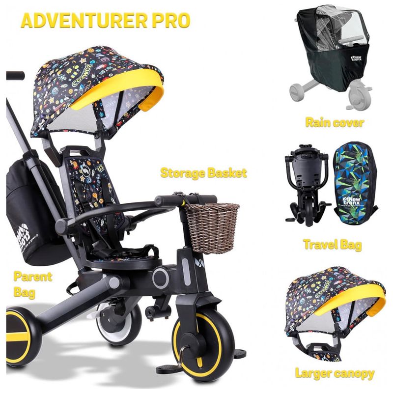 Portátil e conveniente: o recurso dobrável exclusivo do Trixplorer Adventure Pro facilita o transporte e o zenamento. Ele vem com capa de chuva, bolsa para os pais, bolsa de viagem e cesta para maior comodidade durante suas aventuras ao ar livre.
