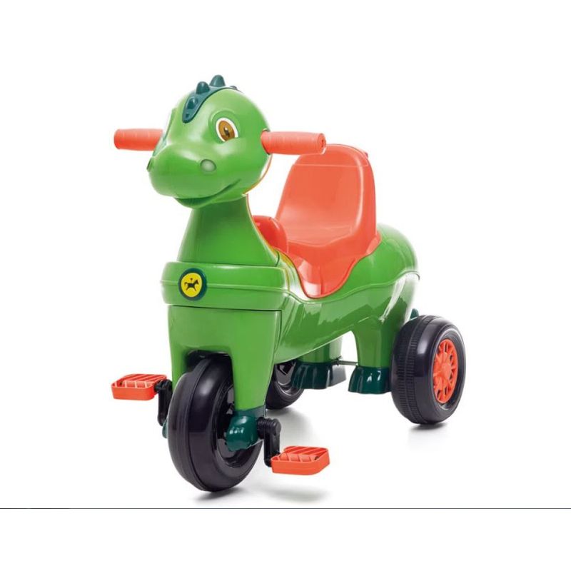 O carrinho 2 em 1, para passeio e pedal que faz sucesso entre os pequeninos. Com design de dinossauro, ele cativa pelos detalhes que encantam, como a crista e o som que imita um dinossauro, além de auxiliar no desenvolvimento da coordenação entre olhos e mãos, coordenação motora fina mãos e dedos, coordenação motora grossa braços e pernas