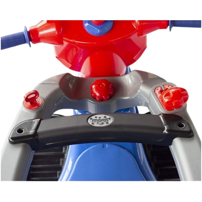 O apoio de pés é removível. Com 02 porta objetos, com e sem tampa para transportar mamadeira, suco, água ou outros objetos. na função pedal: retirando a haste-guia, o apoio de pés e o anel de proteção, a criança pode pedalar e brincar sozinha desenvolvendo o senso de direção e coordenação motora.