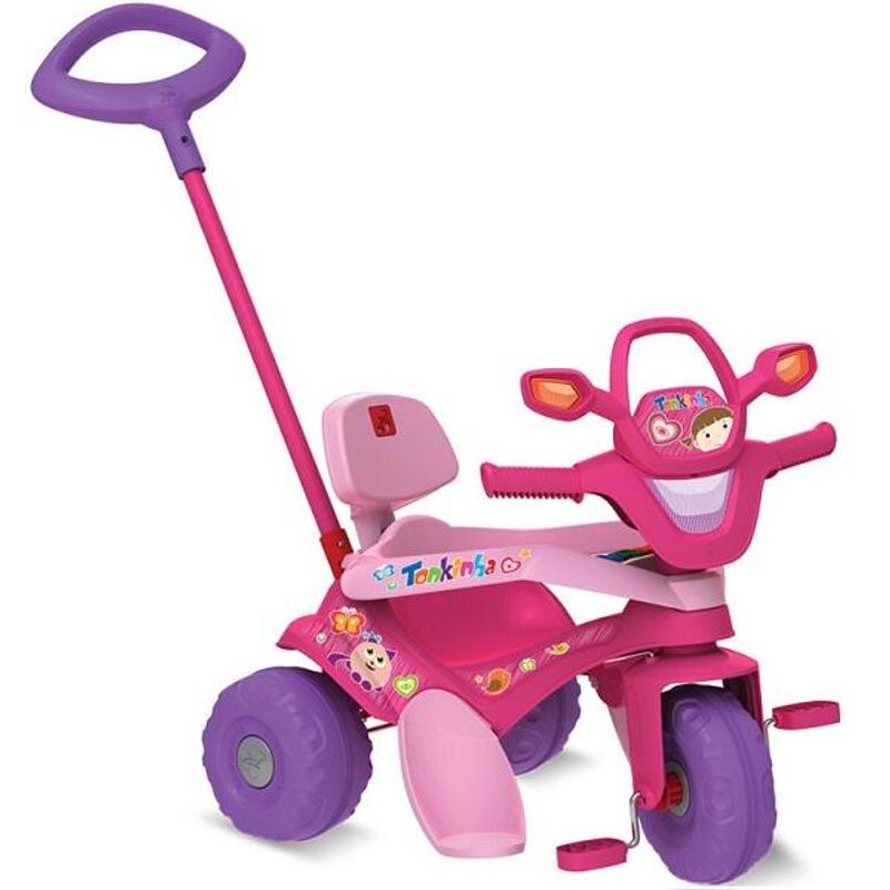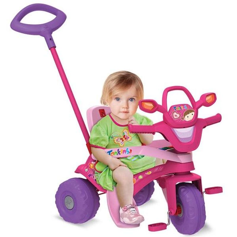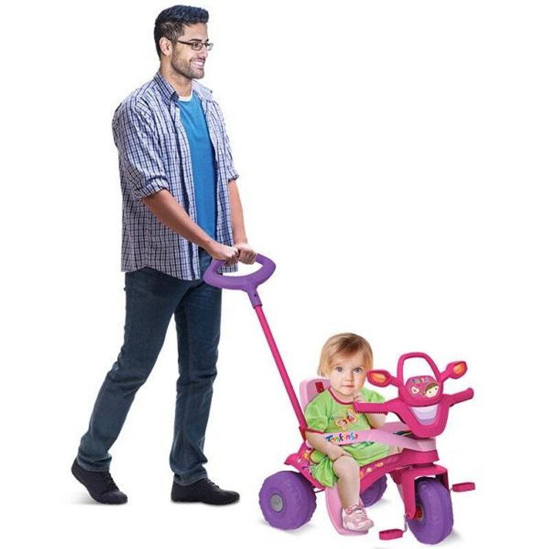 FUNÇÃO PASSEIO: O adulto utiliza a haste direcionável para conduzir o triciclo. Basta destravar o dispositivo de roda livre, colocar o cercado de proteção e apoio dos pés.