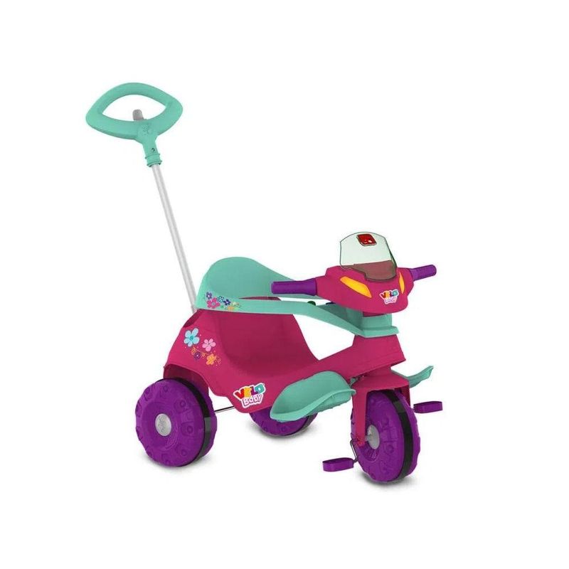 Triciclo Velobaby G2 Passeio e Pedal Rosa - Bandeirante Um triciclo com duas funções, prático e moderno para o adulto e divertido para as crianças! FUNÇÃO PASSEIO: O adulto utiliza a haste direcionável para conduzir o triciclo. Basta , colocar o cercado de proteção e o apoio dos pés. FUNÇÃO PEDAL: Permite à criança pedalar livremente como um triciclo convencional. Basta remover a haste, o cercado de proteção e o apoio dos pés. Haste direcionável e removível. Rodas com anel antiderrapante.
