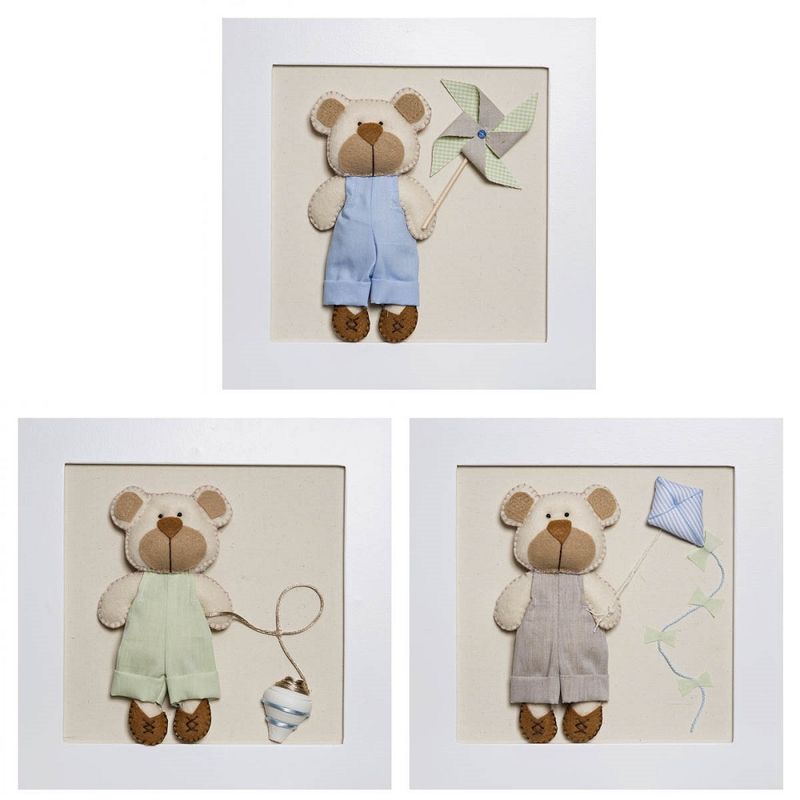 Três quadrinhos decorados feitos em madeira MDF laqueada com tecido de fundo e decoração de feltro.