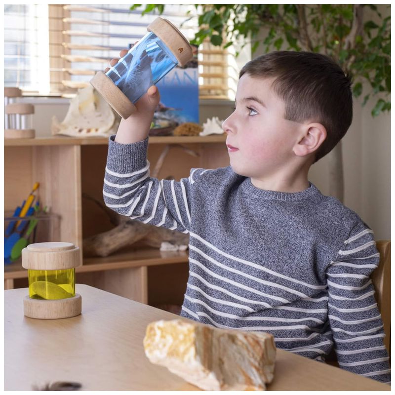 Os Treasure Tubes Primárias da Guidecraft são tubos transparentes coloridos projetados para observação e exibição de pequenos objetos como contas, folhas, brinquedos e galhos. Cada tubo possui tampa plana e removível que mantém os objetos seguros e permite empilhamento. As peças variam entre 7,5 cm de diâmetro por 8,9 cm de altura no menor tubo e 7,5 cm de diâmetro por 14,6 cm de altura no maior tubo, adequados para manipulação visual e sonora em atividades de exploração sensorial e mesa de luz. Indicados para crianças a partir de 3 anos até 10 anos, são fabricados em madeira com janelas acrílicas resistentes, garantindo durabilidade para uso contínuo. O conjunto apoia o desenvolvimento de habilidades motoras finas, reconhecimento de cores e exploração sensorial manual.?