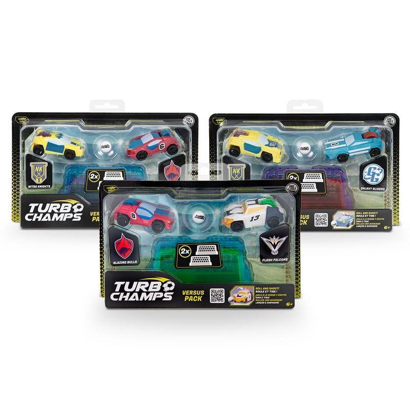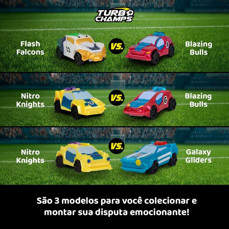 Com o Turbo Champs Desafio 1x1, a rivalidade ganha forma com partidas emocionantes entre dois carrinhos prontos para marcar gols incríveis.