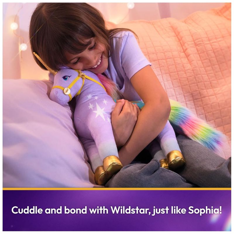 Entre no mundo da Unicorn Academy e celebre a amizade entre cavaleiro e unicórnio com Wildstar, o unicórnio criador de luz do arco-íris de Sophia. Este pelúcia de 38 cm captura todos os detalhes autênticos do personagem do popular programa de animação da Netflix e da série de livros infantis mais vendida.