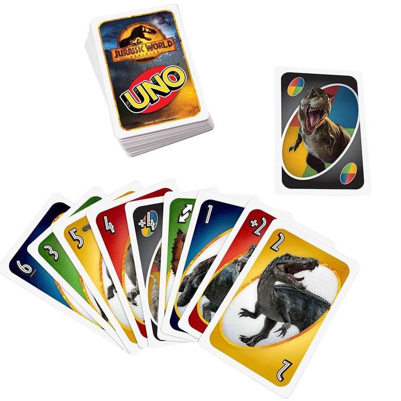 É o UNO que todos nós amamos, mas em uma edição especial, com gráficos baseados em Jurassic World Dominion, o capítulo final da trilogia jurássica mais amada do cinema. As dinâmicas do jogo são as mesmas: os jogadores correm para serem os primeiros a se livrarem de todas as cartas na mão, através da compatibilidade delas com a carta do topo da pilha de descarte, seja por números, cores ou símbolos.