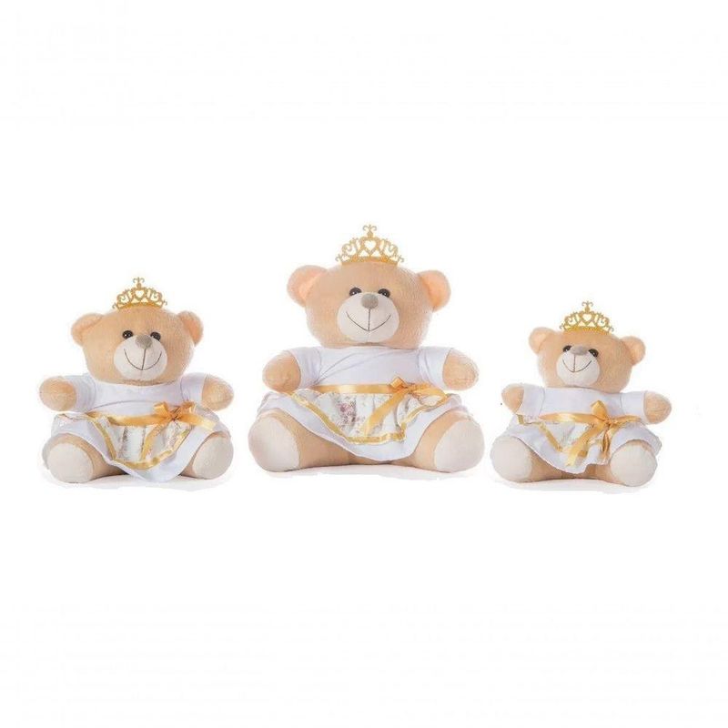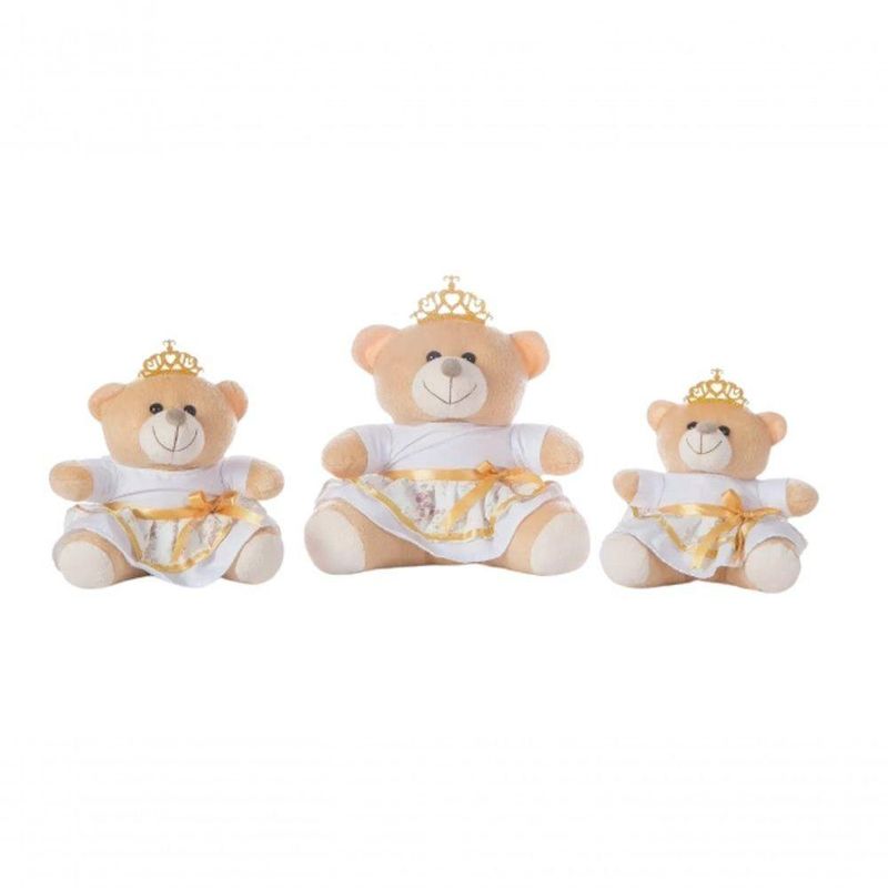 Ursa Pelúcia Princesa 3 unKit com 3 lindos ursinhos decorativos que deixarão o quarto da sua neném e a sua festa ainda mais lindos.A altura de cada um é: 25 cm / 20 cm / 18 cmPerfeitos para usar em Nichos, Prateleiras e em Decorações de Festas.Feitos em pelúcia velboa (pêlo baixo) e cheios com fibra de silicone, são super fofinhos. As roupinhas são produzidas manualmente em microfibra e malha. Finos toques artesanais nos detalhes e acabamentos.Composição:Enchimento: 100% poliésterPelúcia: 80% algodão - 20% poliésterCorpo Fixo / Posição: SentadoAltura: 27.00 cmLargura: 22.00 cmComprimento: 30.00 cmPeso: 800 g