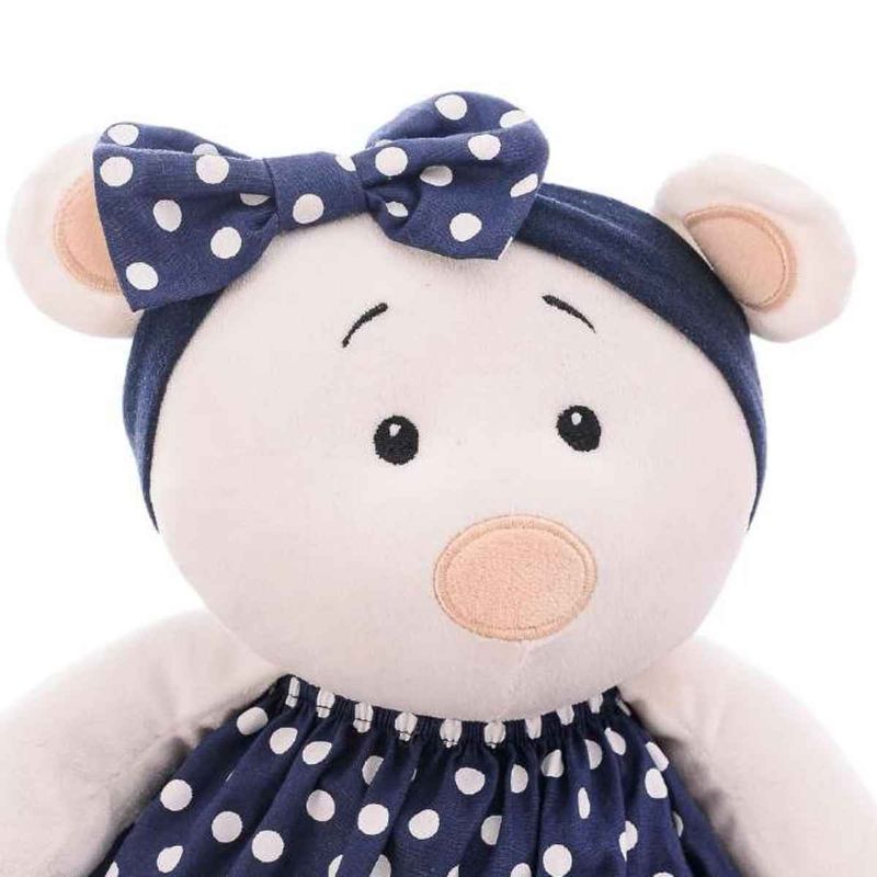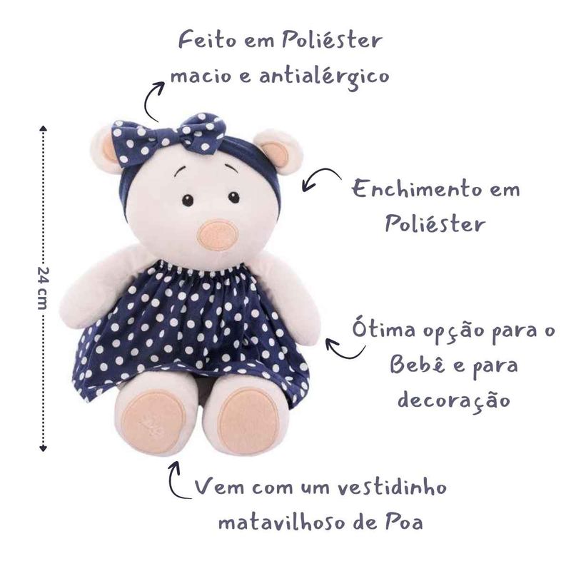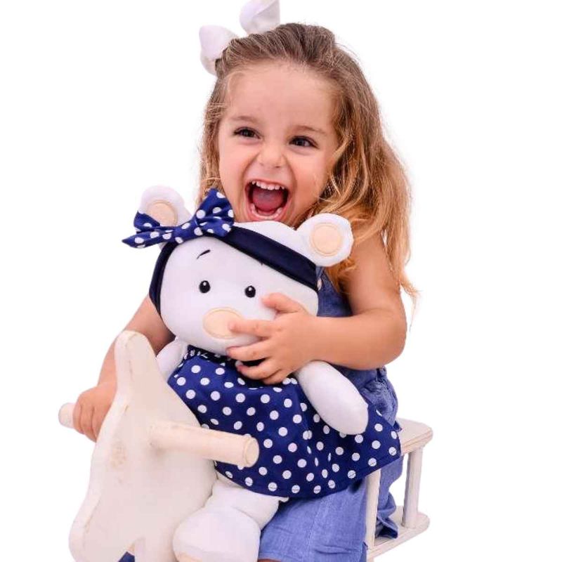 Ursinha Lola de tecido macio, perfeita para acompanhar as crianças em momentos de carinho, brincadeiras e imaginação, com design delicado e tamanho ideal para abraçar. A ursinha de pelúcia Lola foi criada para encantar desde o primeiro olhar. Com seu adorável vestido de bolinhas e expressão delicada, ela se torna a companheira ideal para aventuras lúdicas, momentos de afeto e histórias cheias de imaginação. Seu formato alongado facilita o abraço, trazendo conforto e sensação de aconchego para as crianças.