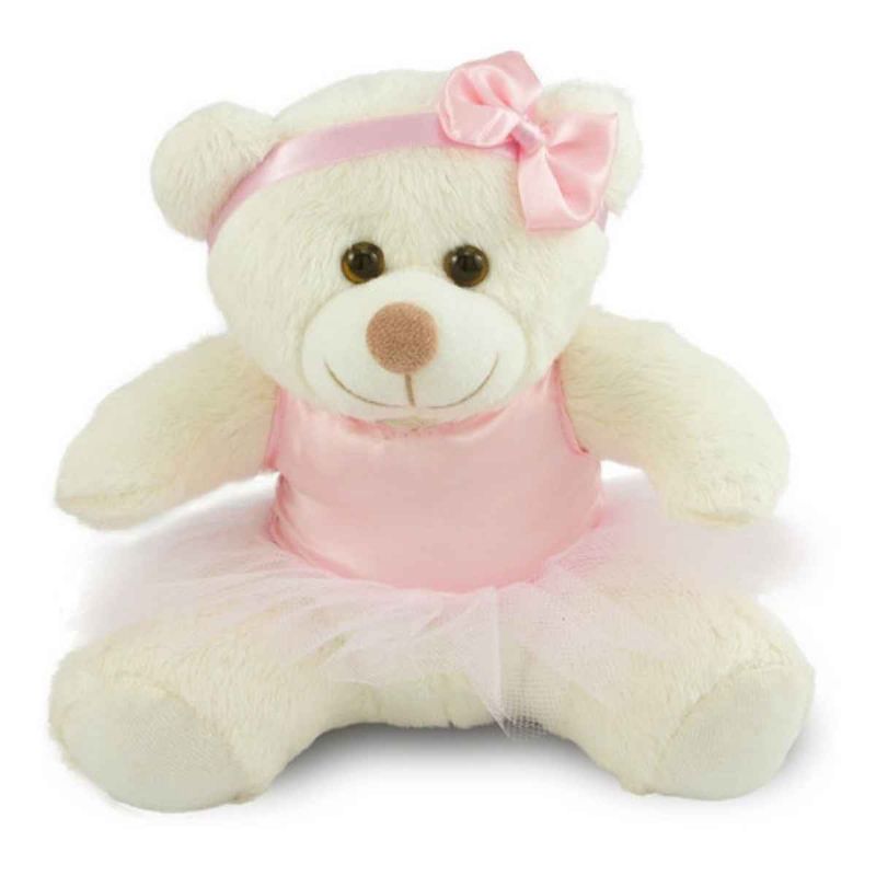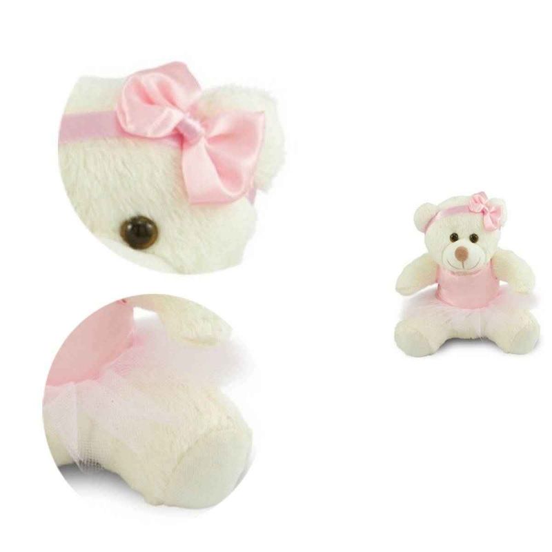 A Ursa de Pelúcia Bailarina veste uma graciosa roupinha de bailarina, com saia de tule e acompanha uma tiara com laço na cabeça. Não tem nenhum acessório que possa prejudicar a criança e os olhinhos são firmemente presos para dar maior segurança.