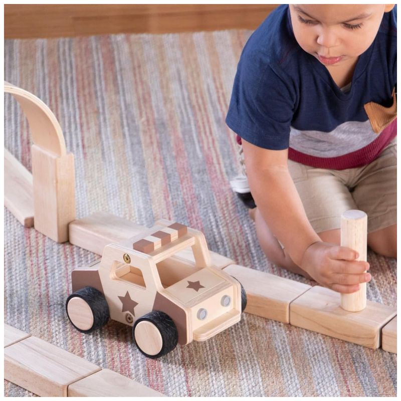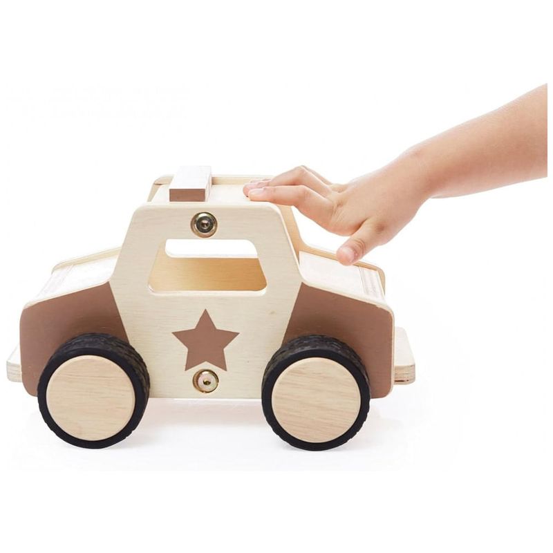 O Guidecraft Wooden Police Car é um veículo de madeira em formato de carro de polícia, indicado para crianças a partir de 2 anos, ideal para complementar cantos de blocos e espaços de brincadeira dramática em casa ou na escola. O brinquedo é produzido em compensado de bétula com ilustrações serigrafadas em tons naturais, e rodas grandes em plástico macio com superfície antiderrapante, que rolam suavemente em diferentes tipos de piso.?