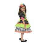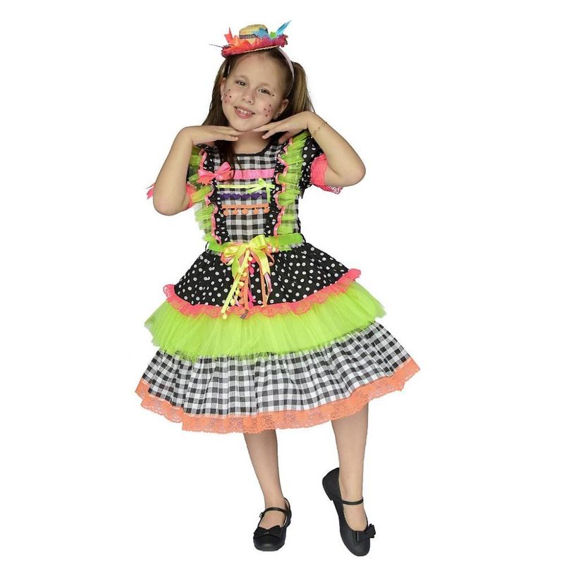 Saia rodada com babados em camadas, sendo o babado do meio de tule flúor, que dá volume e deixa o modelo super diferenciado e exclusivo. Estampa: mix de estampas xadrez e poá com cores que caracterizam vestido caipira de Festa Junina.