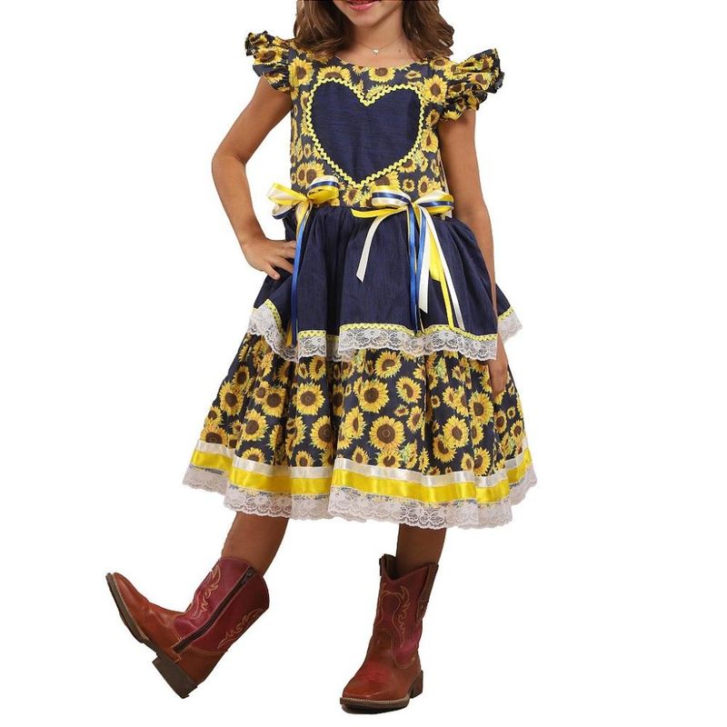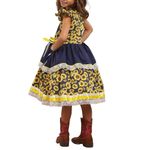 Vestido Junino Lelê Petit Coração Girassol Azul Marinho As pequenas não podem ficar de fora nesse Arraiá! Armação: Todos os vestidos vão a com anaguá embutida, todo forrado em tecido 100% algodão, garantindo o conforto da criança.
