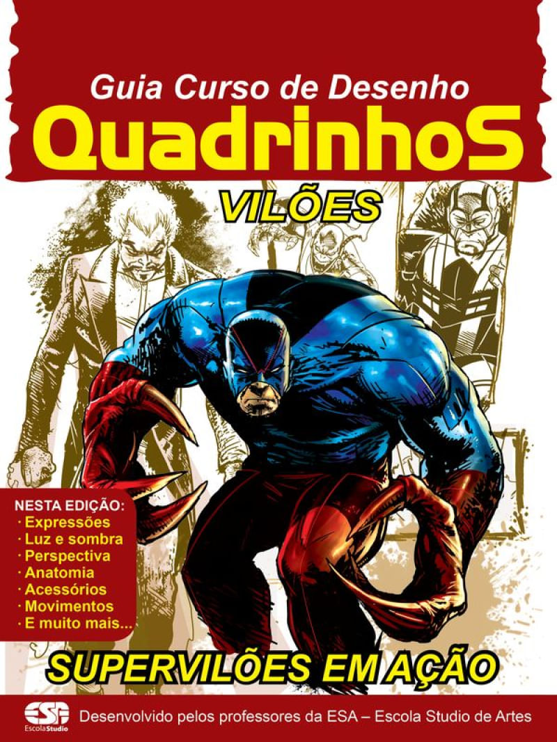 Guia Curso de Desenho Quadrinhos Vilões traz os vilões Coringa, Magneto e Doutor Doom. Mostra quais melhores materiais para serem utilizados e aperfeiçoar a técnica de desenhos incríveis. Em seguida vem o passo a passo da anatomia, em como desenhar a cabeça e seus elementos, a anatomia do corpo, a perspectiva anatômica, e muito mais. Um guia básico completo para começar os melhores desenhos