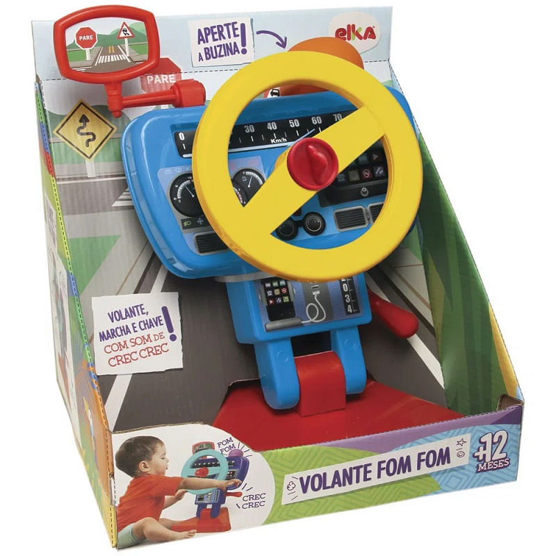 Um super volante com retrovisor, marcha e som de buzina eletrônica, que auxilia na coordenação motora da criança. Retrovisor regulável, volante giratório, botão que aciona som de motor e buzina, painel com movimento giratório e sobe e desce, câmbio com movimento e som de crec crec e possui ventosas para fixação.